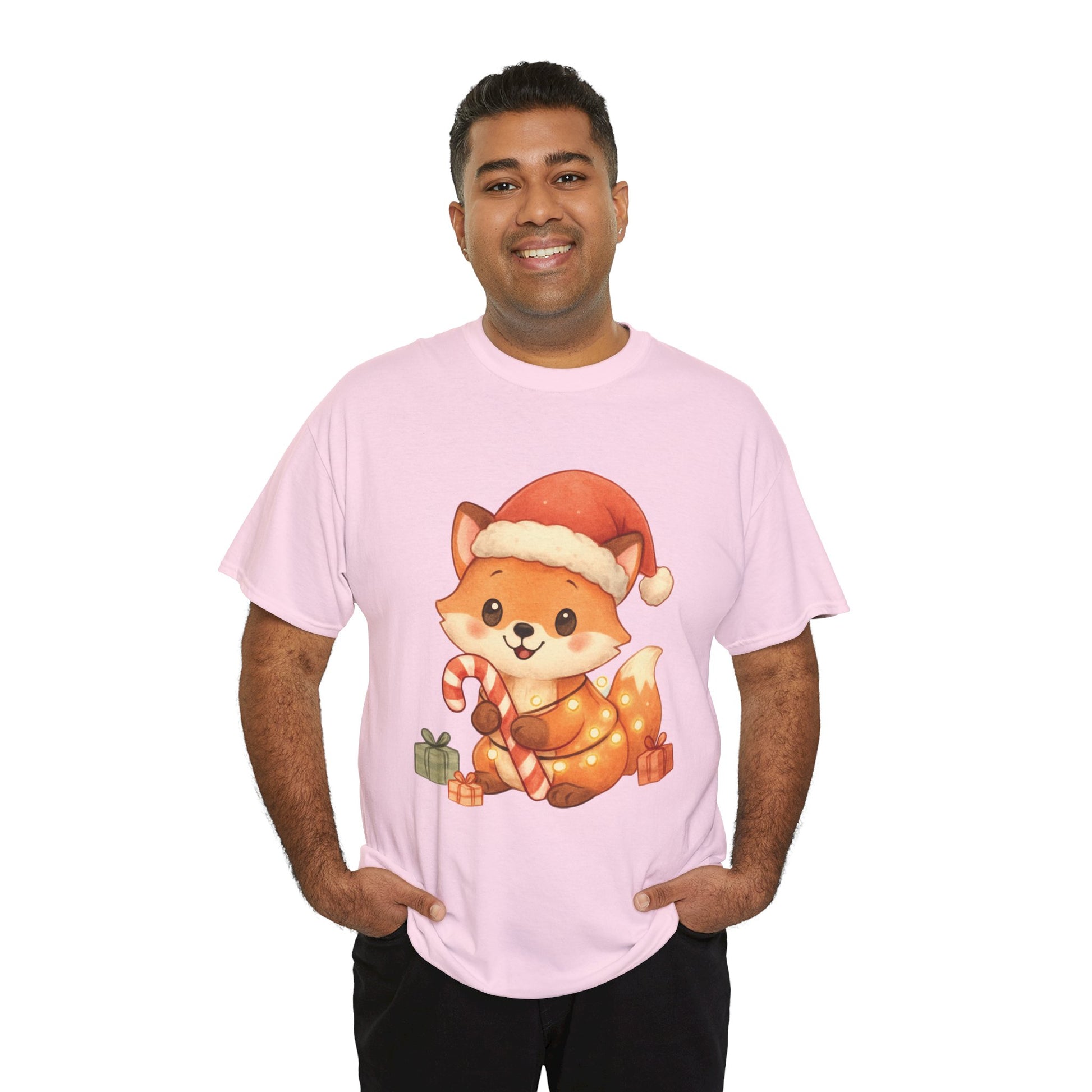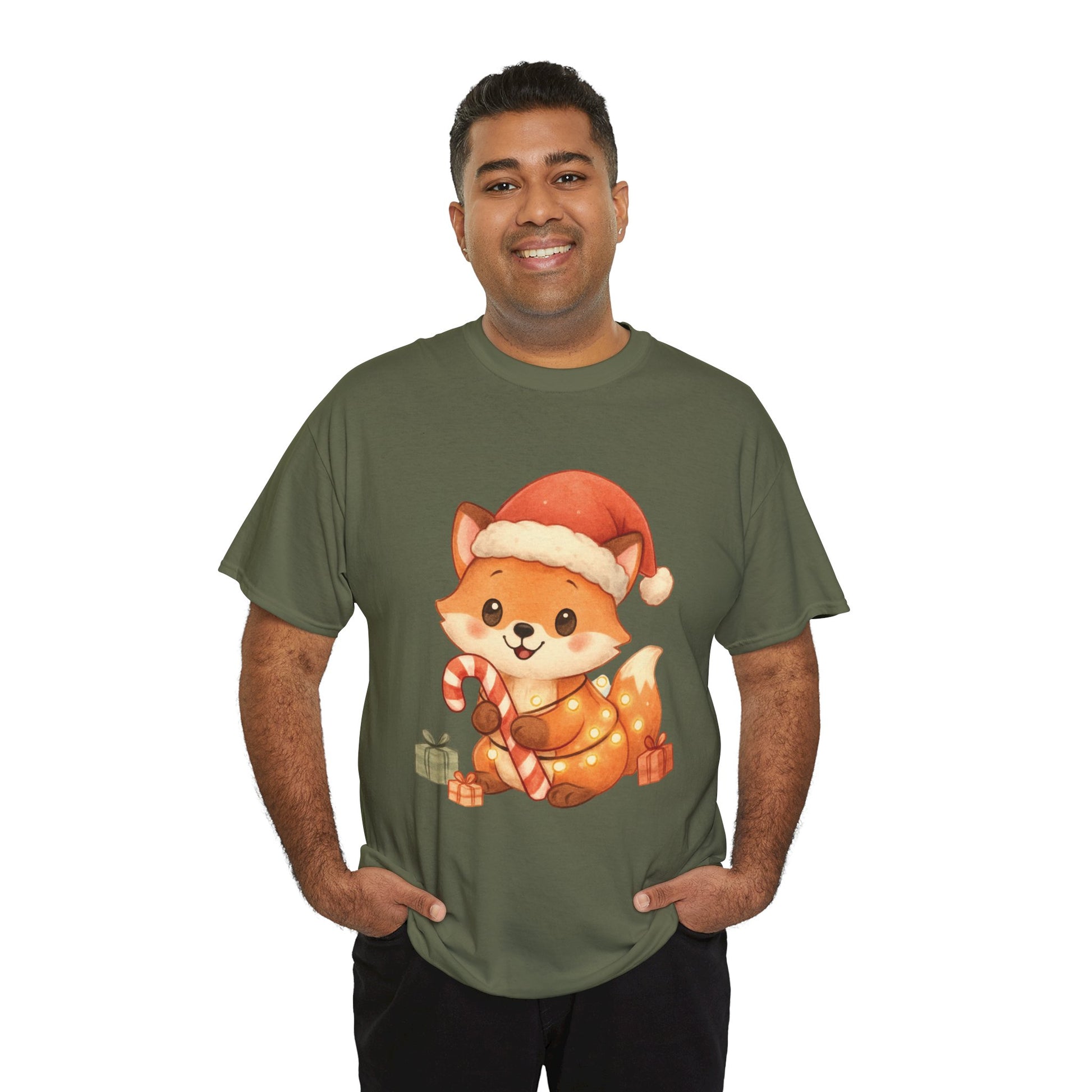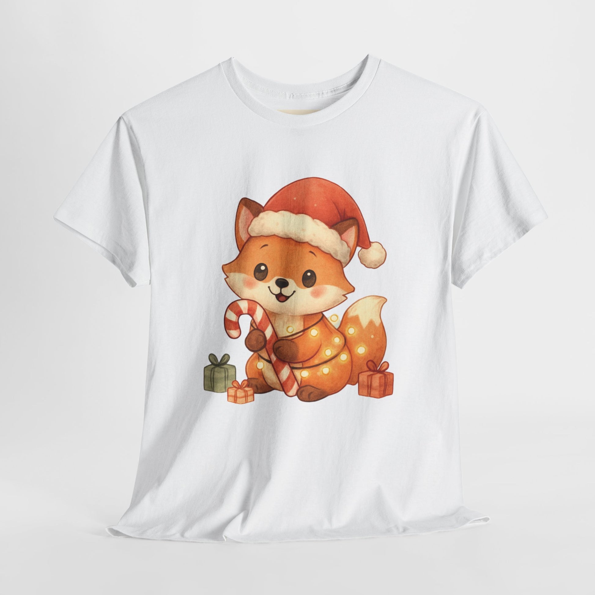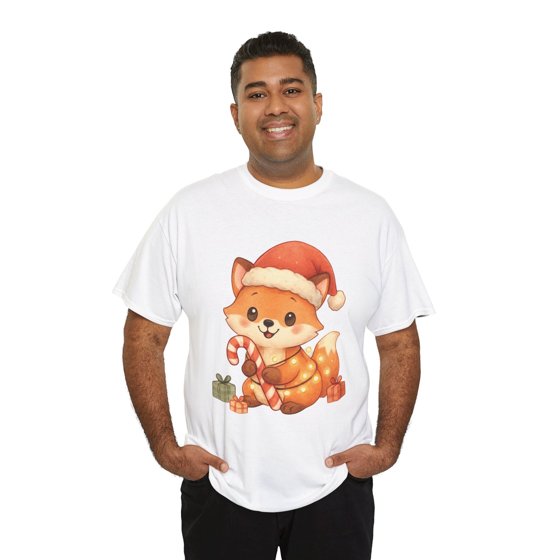 Christmas Fox T-Shirt perfect for the winter holidays, featuring a cute design for animal lovers. This Unisex Heavy Cotton Tee is ideal for cozy casual wear and makes a great gift option. The garment is made from specially spun fibers, ensuring a strong and smooth fabric, perfect for printing. It is targeted towards adults and is relevant for Christmas and winter celebrations.
