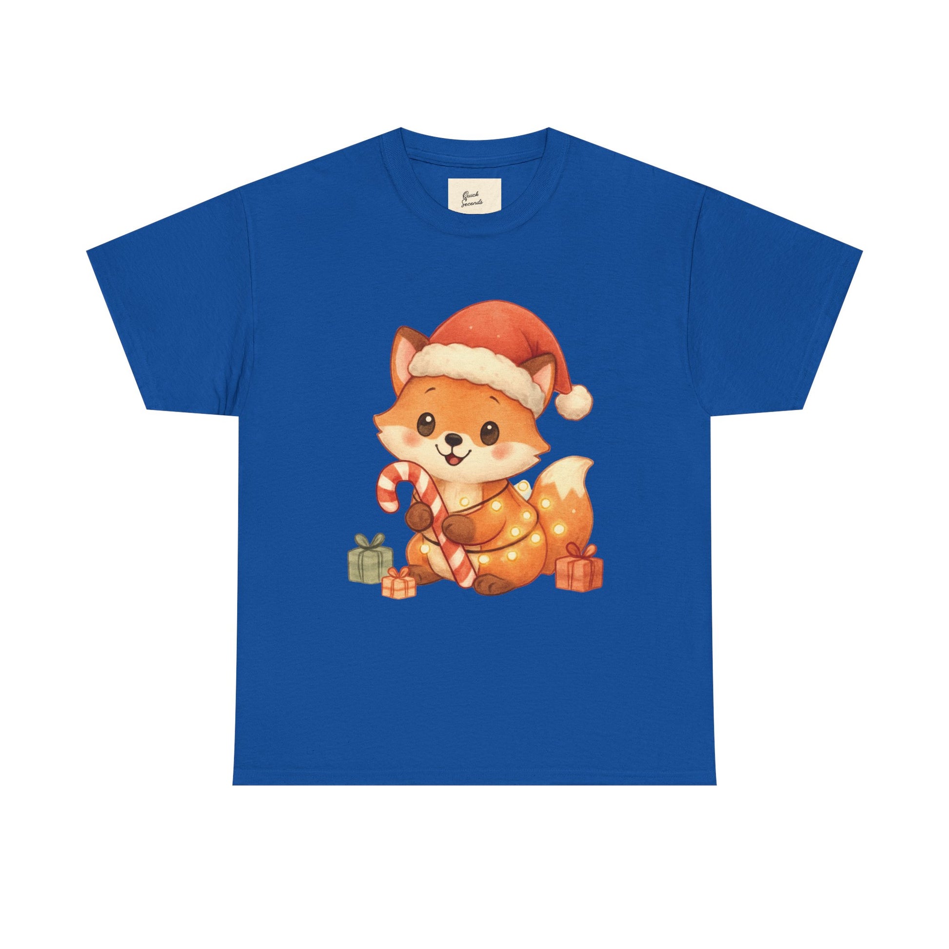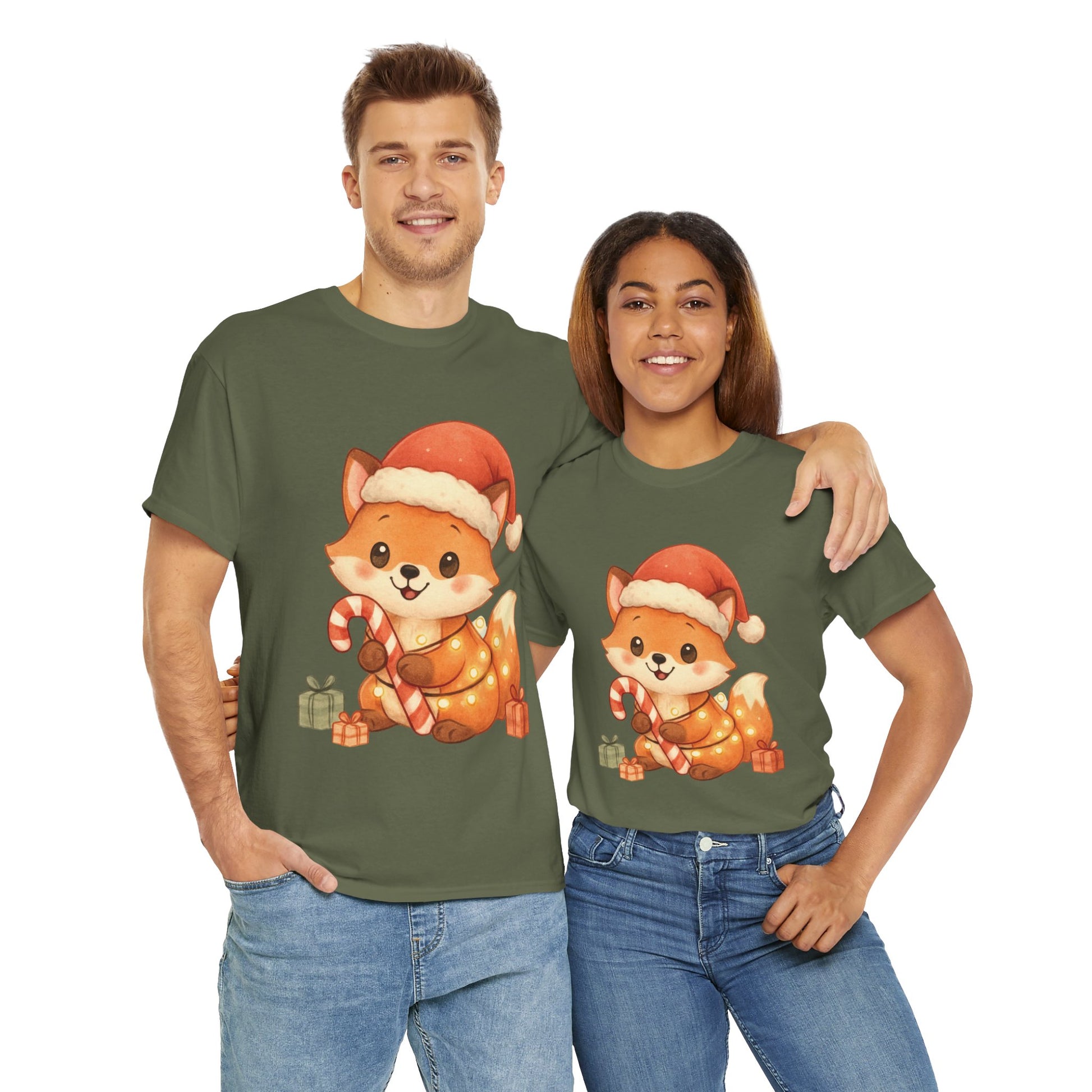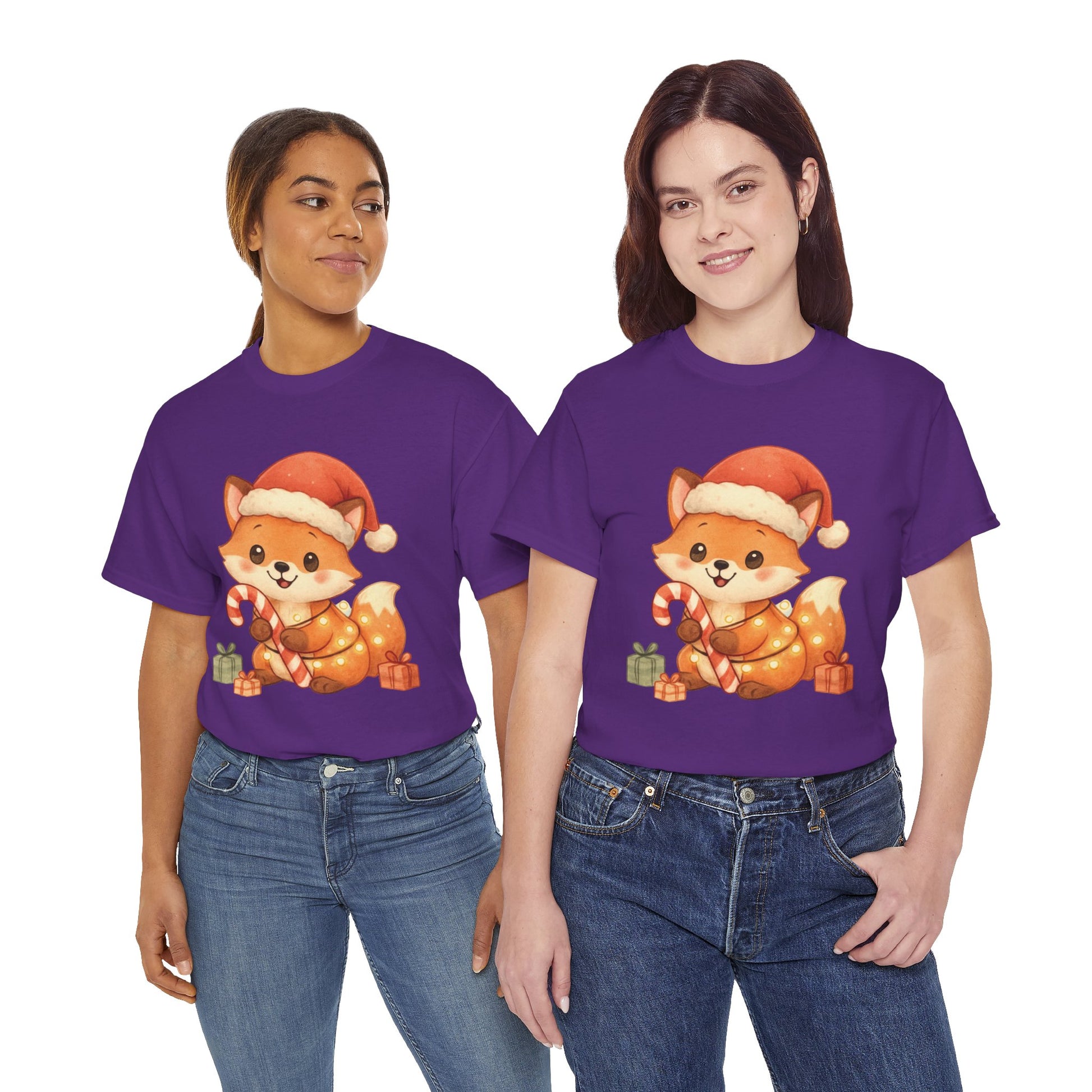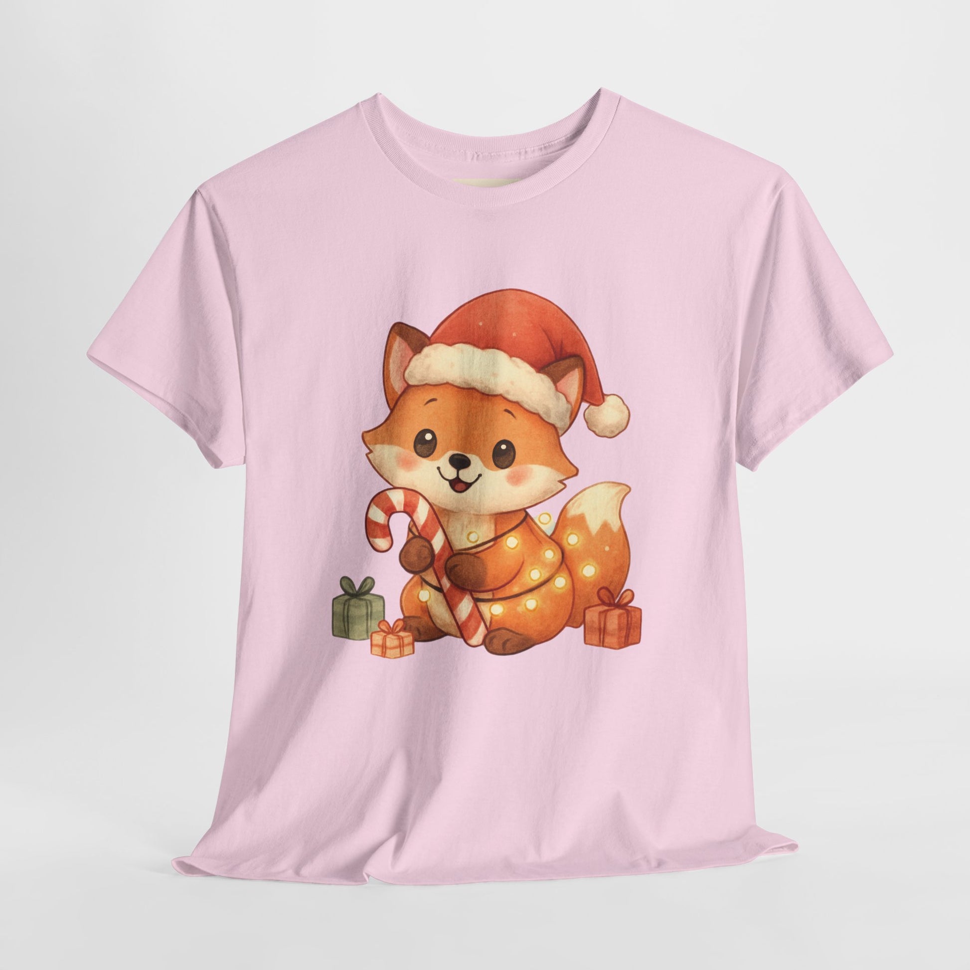 Christmas Fox T-Shirt perfect for the winter holidays, featuring a cute design for animal lovers. This Unisex Heavy Cotton Tee is ideal for cozy casual wear and makes a great gift option. The garment is made from specially spun fibers, ensuring a strong and smooth fabric, perfect for printing. It is targeted towards adults and is relevant for Christmas and winter celebrations.