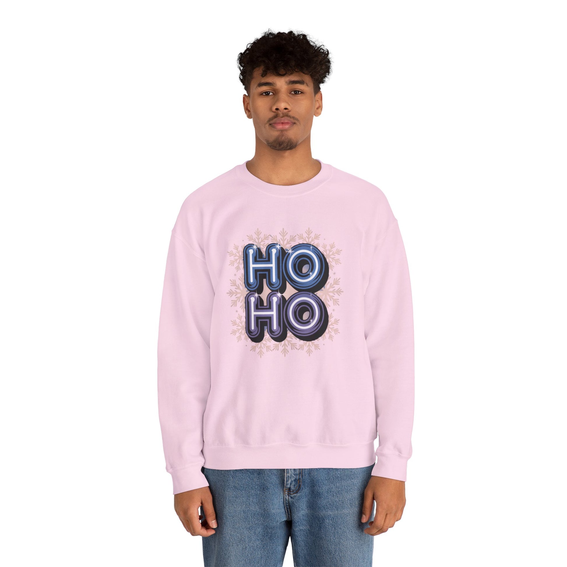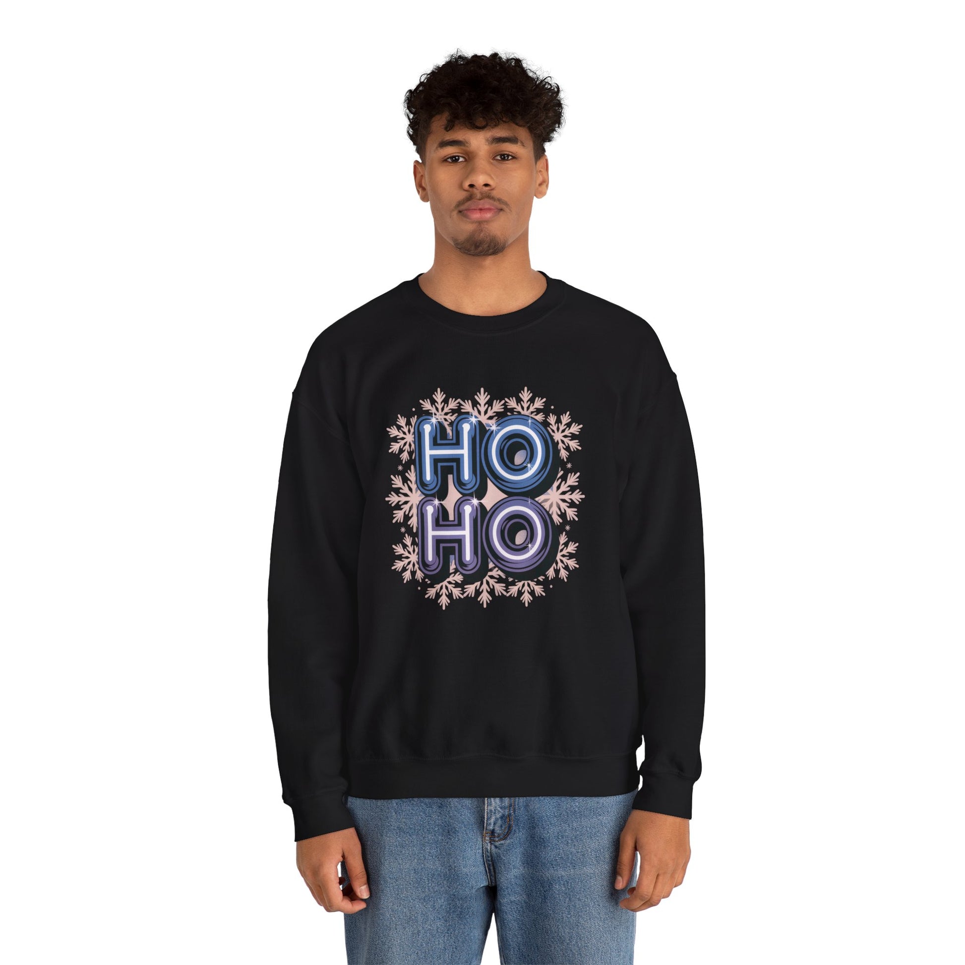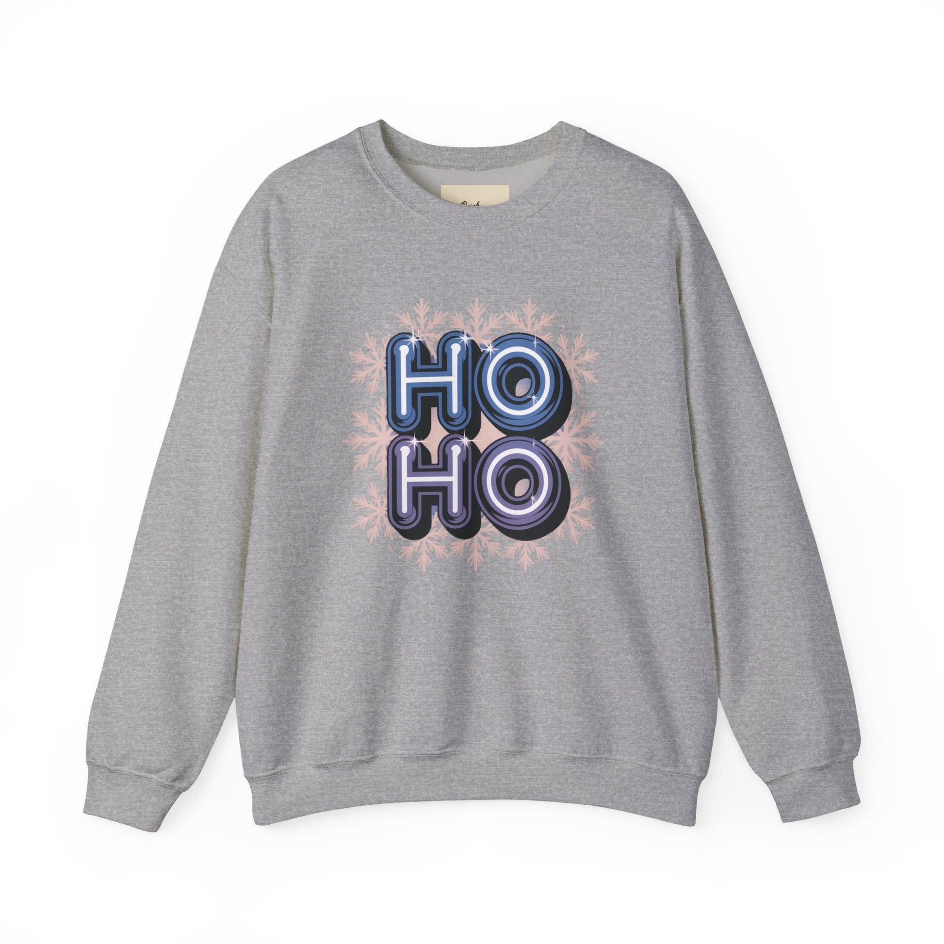 A royal blue unisex crewneck sweatshirt featuring mirrored Y2K 'HO-HO' typography in chrome finish with a snowflake background. Perfect for adding a festive touch to your winter wardrobe, this sweatshirt is ideal for adults looking for a cozy and stylish holiday outfit.