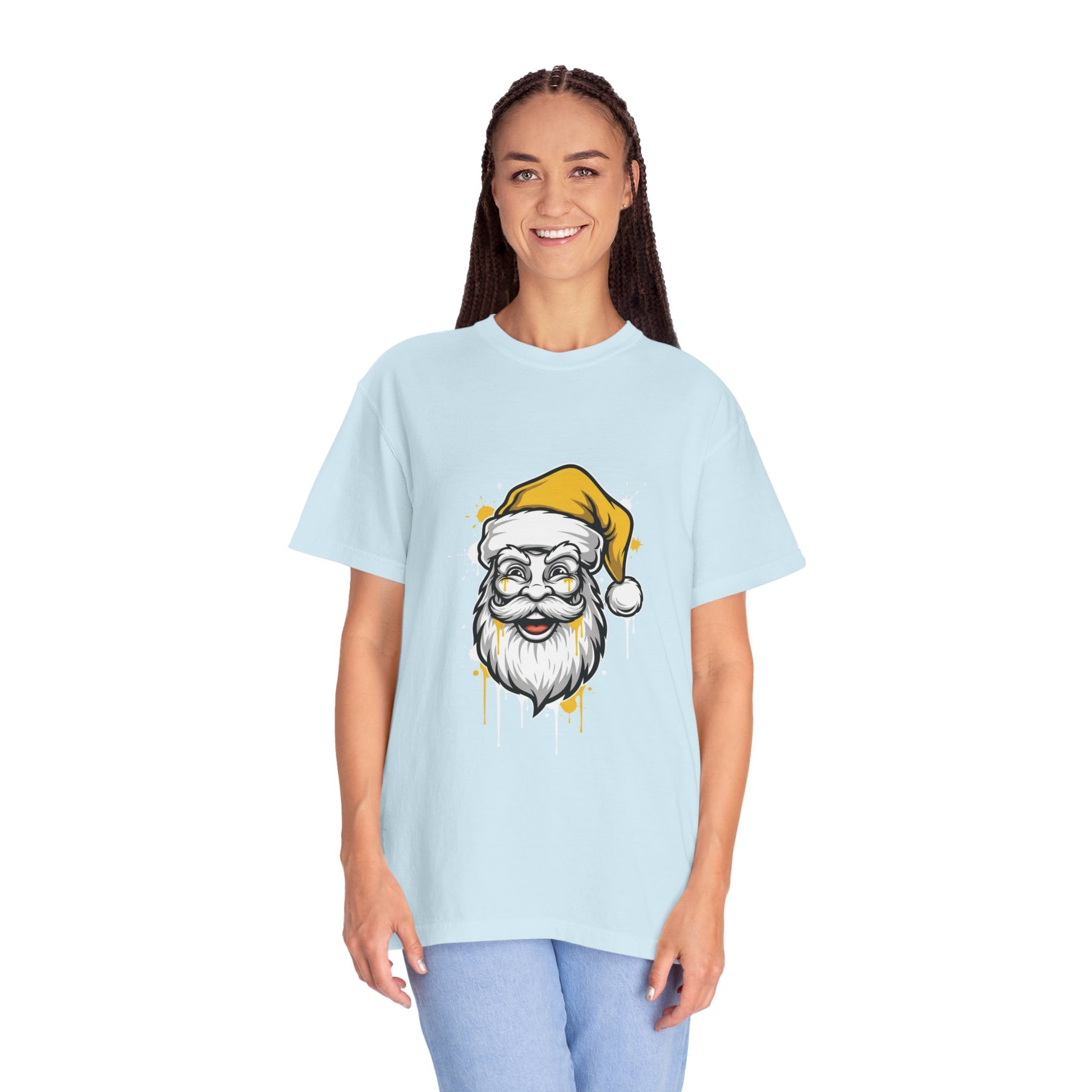 This street-wear style graffiti Santa face T-shirt features an oversize back print with a dripping paint effect on a black background, accented with pops of electric yellow. The edgy design gives off a cool and urban vibe, perfect for those who love unique and bold fashion statements. Ideal for Christmas enthusiasts and those who enjoy celebrating the holiday season with a twist.