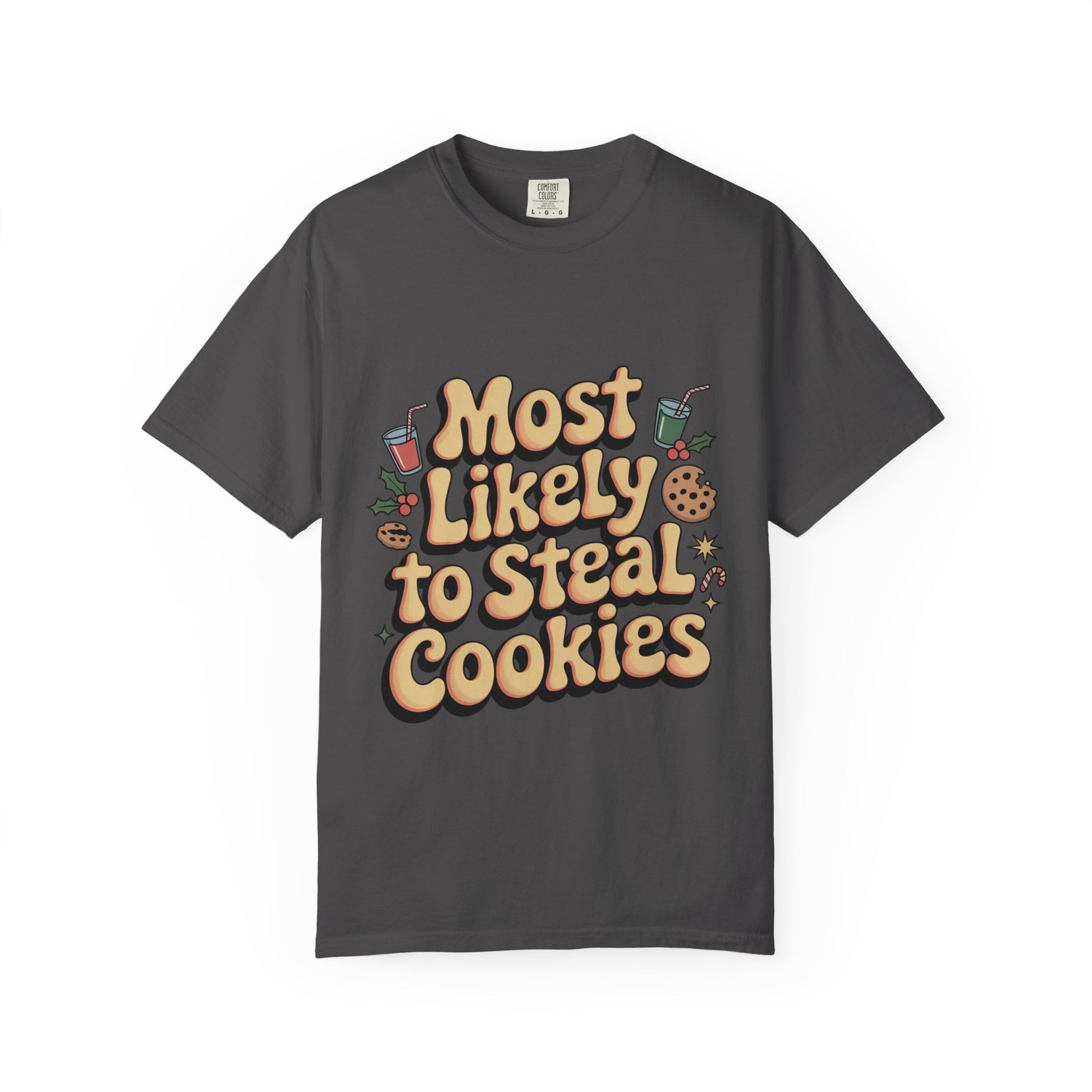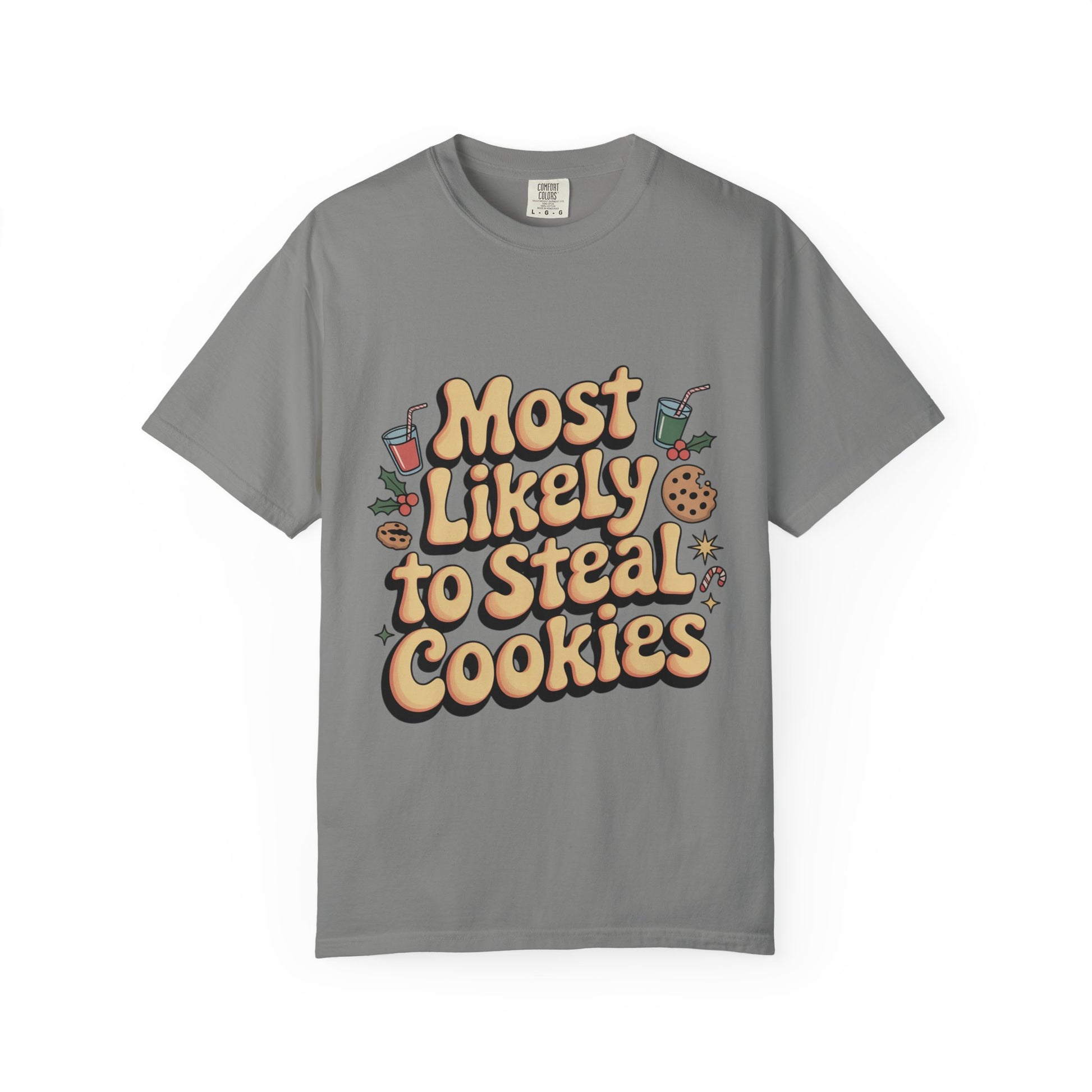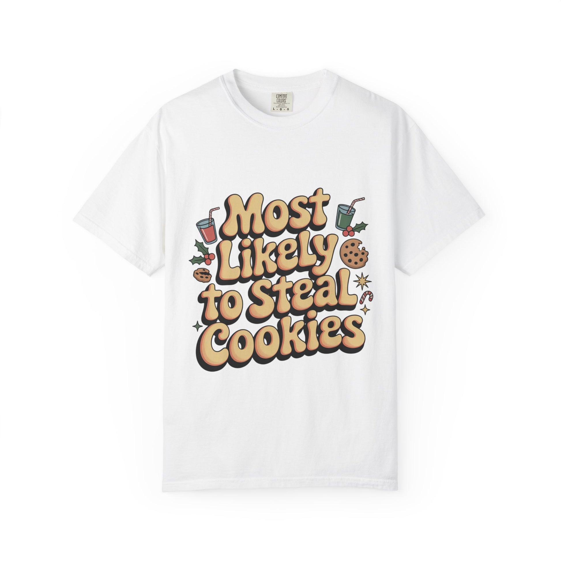 Vintage-style unisex T-shirt with phrases like 'Most Likely to Steal Cookies' in retro 70s font and Christmas elements scattered around. Perfect for those who love retro vibes and want to add a fun, festive touch to their outfit. Ideal for the holiday season, Christmas celebrations, and fans of vintage aesthetics.